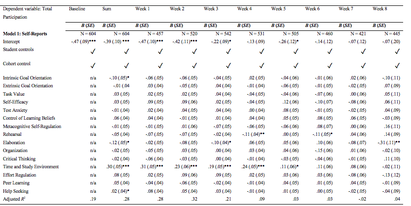 The adjusted R2 of the models across weeks indicate that students’ self-reports seem to explain more variance in participation in the weeks prior to the collection of the self-reports (week 4) than participation in the weeks afterwards. The self-reports on time and study environment management explain a substantial proportion in variance in participation up and including week 4, but this changes in the weeks after the self-reports were collected. Self-reports on rehearsal and elaboration strategies emerge as significant predictors of participation in week 3-6 and week 8.
