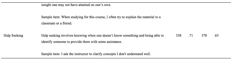 The MSLQ was administered once in the seminar of week four, along with several general questions about background variables, such as age and gender. The MSLQ contained 81 questions of which 31 items determined students’ motivational orientation towards the course and 50 items assessed metacognition. The questions assess the propensity of students to engage in self-regulated learning within the specific context of this course, but, overall, the MSLQ has been classified as an aptitude measure of self-regulated learning (Muis et al., 2007; Zimmerman, 2008). Students answered with a 7-points Likert scale, ranging from ‘not at all true for me’ to ‘very true for me’. The motivational orientation is divided into six subscales: Intrinsic goal orientation, extrinsic goal orientation, task value, self-efficacy, control beliefs and test anxiety. Metacognition was scored on nine subscales: rehearsal, elaboration, organization, critical thinking, metacognitive self- regulation, time and study environment, effort regulation, peer learning and help seeking. A definition per subscale is provided in Appendix A. For a complete description of the MSLQ and each of its subscales we refer to the manual of the MSQL (Pintrich, 1991).