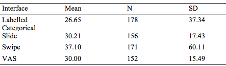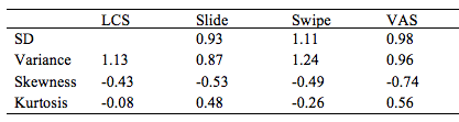 While the skew and kurtosis outcomes for each interface were within acceptable boundaries, the graphical presentation made a clear case for Swipe, VAS and Slide (in that order) as providing a more normal distribution of scores. Given the reliance of most of our statistical procedures on such a distribution and the amount of potential data collected with mobile interfaces in the years to come, it seems reasonable to continue to develop continuous self-report interfaces.