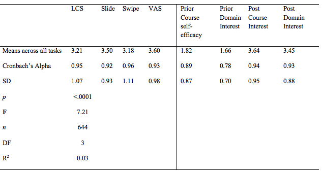 Analysis for the empirical component of the current study began with an examination of the overall and interface specific descriptive statistics for the scale means and reliability (RQ1). ANOVA were conducted for the four interfaces, overall and task by task (RQ2). Regressions were conducted from prior Domain interest and Course self-efficacy predicting Task interest for each interface separately; then regressions from Task interest predicting Course interest in the future was conducted and compared (RQ3). Factor loading (Confirmatory Factor Analysis) for results from each interface was then compared (RQ4). The central tendency, both visual and Skew/Kurtosis were calculated and reviewed (RQ5). Finally, an ANOVAs were conducted to compare completion times for each interface (Hypothesis #1).