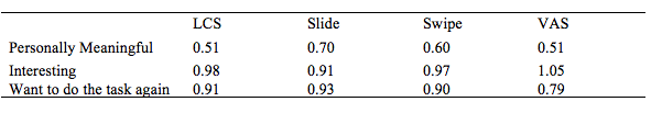 The second is the time difference to complete the survey. Marked differences supporting past findings pointing to the ease of LCS over other formats like VAS were observed. Rather than suggesting, as many previous researchers have, that LCS is therefore preferred due its ease of administration, we suggest that the flexible nature of mobile devices might be channeled to overcome this issue. A careful review of the survey completion time data suggested that the difference between LCS and Slide/Swipe narrowed substantially with increasing use. More intuitive interfaces for Slide/Swipe might be developed to close the gap, and animated directions for interacting with the interfaces might also be used to ameliorate this issue.