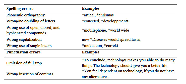 This study included both spelling and punctuation errors in our manipulation since relevant rubrics often list spelling and punctuation issues in the same category (usually “language mechanics”). We varied the variable within the texts similar to Raforth and Rubin (1984) and Sweedler-Brown (1993) in two steps (“few errors” vs. “many errors”). In the text version with few errors, spelling errors were reduced to one error per 100 words, whereas in the text version with many errors, spelling errors were raised to seven errors per 100 words. The numbers (frequency) of spelling errors were derived from the mean number of spelling errors in the high and low-quality texts of corpus overall. Thus, we aimed to ensure that the manipulation occurred within the range of the students’ language competencies. Table 1 displays the types of spelling and punctuation errors we integrated into text variations with a low quality of spelling.