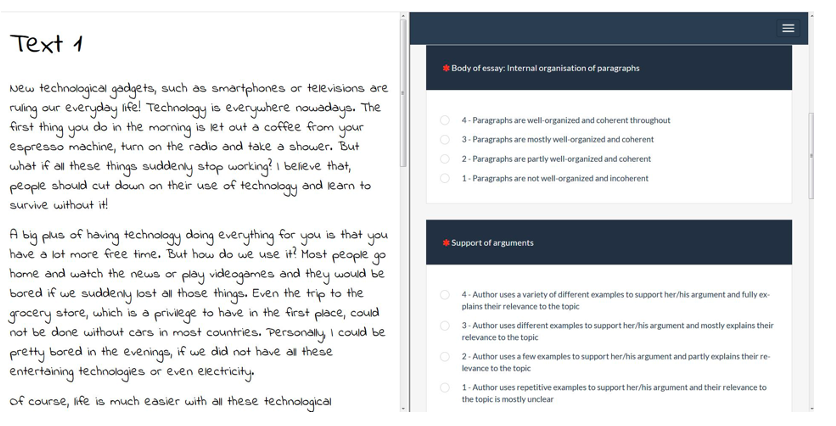 The texts came from students who had been learning English as a second language for five years and had been instructed for four weeks on the form, structure, and content of argumentative essays. At the end of the teaching unit, the students wrote an argumentative essay in 90 minutes answering the following writing prompt: “Do you agree or disagree with the following statement? As humans are becoming more dependent on technology, they are gradually losing their independence.” All texts were of similar length (between 450 and 465 words) since text length significantly influences text assessment (Wolfe et al., 2016).