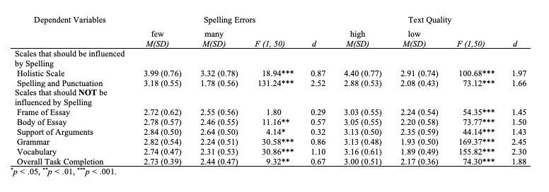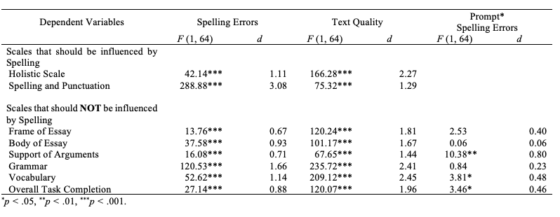 Additionally, the analyses of the scales that should not be influenced by spelling (frame of essay, body of essay, support of arguments, grammar, vocabulary, and overall task completion) showed significant multivariate main effects for the number of spelling errors (F(6, 59) = 28.43, p < .001), the quality of the texts (F(6, 59) = 48.43, p < .001), and the prompt (F(6, 59) = 1.32, ns).