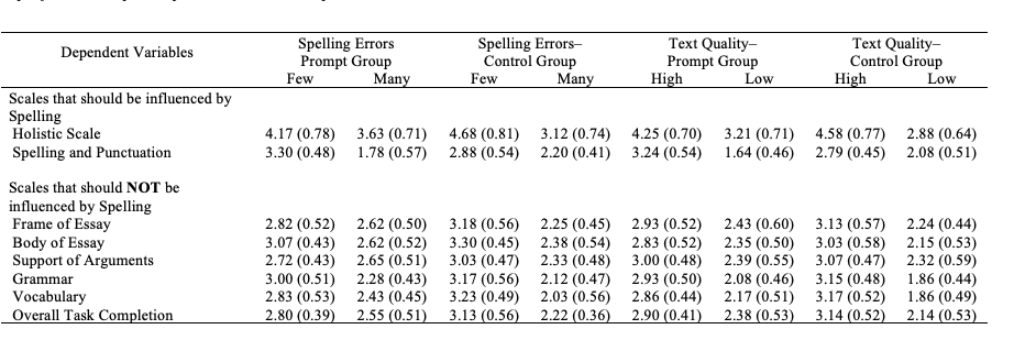 The test for the effect of the prompt (Hypothesis 4) was a one-sided, post-hoc analysis of the interaction between spelling and prompt. It showed significant results on the scales support of arguments, vocabulary, and overall task completion. The prompt reduced the halo effect of the number of spelling errors on these scales (see Table 3).