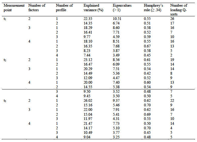 1. To estimate the degree of similarity between profiles, we used the number of distinguishing items. In the traditional Q-methodology approach, the decision on how many Q-sorts to extract is based on the number of distinguishing items. A smaller number of distinguishing items indicates greater similarity between different Q-sorts. We used this approach to match similar profiles of the three measurement points. The profiles with the lowest number of distinguishing items were matched. For this calculation, we used an adopted version of the “qmethod” R-packages (Zabala, 2018), where we entered the profiles of each measurement point and compared the position of the statements in each profile per measurement point.