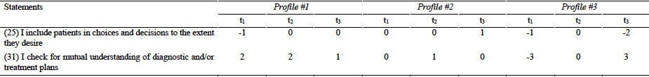 Participants in profile #2 considered gathering information in a structured way using appropriate conversation techniques to be less important (6: -1; 10: -3; 17:0; 20: -3). Moreover, the students evaluated communicating concrete information about the diseases and their possible progress (2: -1; 19: -2; 23: -2) as less important.