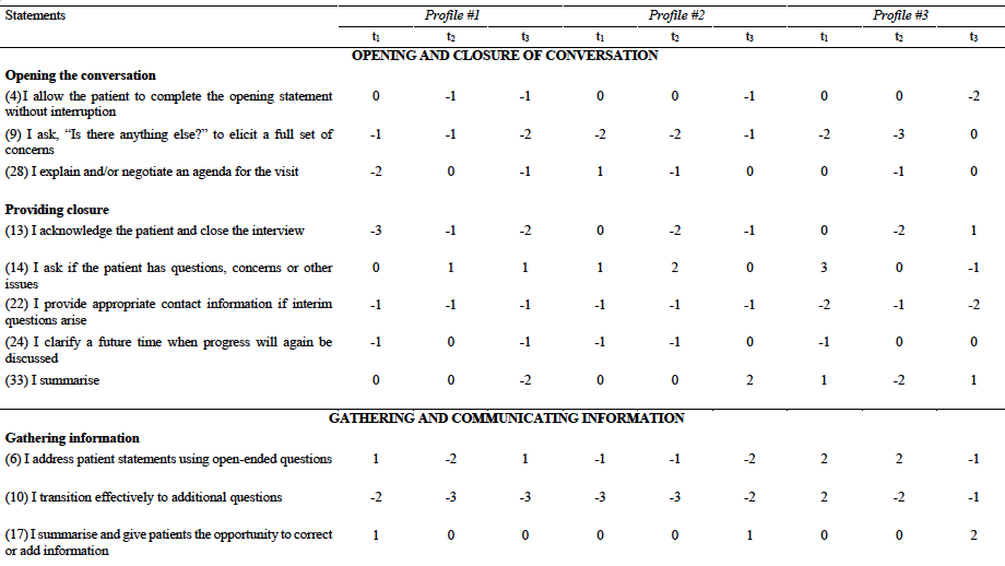 Individuals in profile #1 found opening and closing the conversation (28: -2; 13: -3) to be a less important aspect of a good doctor-patient dialogue.