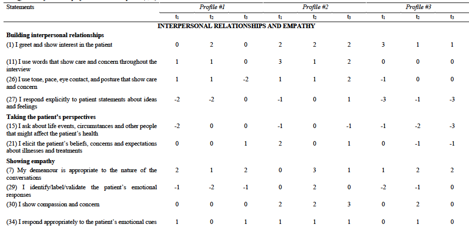 Respondents in profile #1 emphasised that the external appearance of the students should be appropriate, but regarded addressing the patient’s concerns and needs (7: +2; 11: +1; 26: +1; 29: -1; 27: -2)1 as less important for demonstrating empathy and building a relationship with the patient. Regarding perspective taking, exploring the patient’s concerns and expectations (21: 0) was considered more important than addressing circumstances of the patient’s life (15: -2).