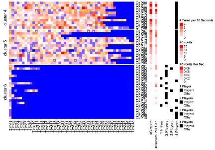 The annotations to the heatmap’s right are labels and were not used to group the player trajectories. “#Circuits” represent the total number of circuits created by that player, with the brighter red indicating more circuits created. “#Circuits Per Sec” shows the total number of circuits created per second. The last four annotation columns on the far right indicate how many other simultaneous players were present with that player.