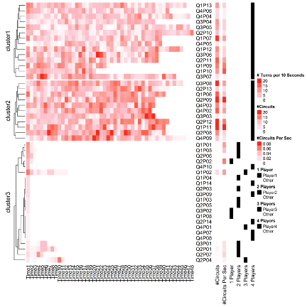 With players and play stations defined, we restructured the dataset into 10-second intervals of “playtime.” Figure 4 displays players as rows and each of the fifty 10-second timeslices as columns, with a brighter red indicating 20 or more actions within those 10 seconds, and white indicates no data. “Actions” are defined as any logged event in that player’s playstation during that 10 seconds. The clusters were formed by cross comparing the activity levels in these player “trajectories” to investigate whether players engage with the table with the same patterns of intensity over time.