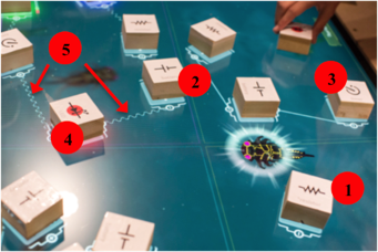 To that aim, we analyzed logfile data from a collaborative tabletop exhibit, Oztoc (Tissenbaum et al., 2017, Figure 1), through hierarchical cluster analysis (HCA) and heatmap visualizations. The game’s objective is to catch fish by creating circuits with different colors and numbers of LEDs. The game space has four separate play stations by design to facilitate collaborative inquiry. The players can create circuits on their own or with the help of others.