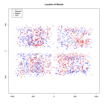 Using the ADAGE system (Lyons, 2014), the Oztoc table tracks the movement, addition, and removal of blocks (or circuit “components”) from the table. It also records actions performed with the blocks while on the table (e.g., connections between components). The program logs each event with a timestamp and X-Y coordinates for four types of circuit component blocks (resistors, batteries, LEDs, and timers). We computed the seconds from the timestamps since the last event to determine the movement rate of pieces, which we use as a proxy for the players’ level of activity. Play stations, playerIDs, and sessionIDs were assigned as described next.