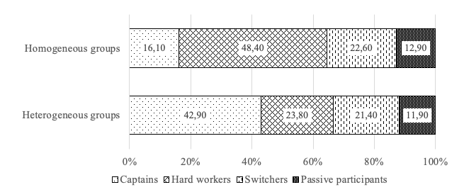 A Chi-square test was then used to evaluate the relation between cooperative behaviours and perspective taking at the group level (i.e., heterogeneous and homogeneous group composition based on group members’ perspective-taking abilities). More specifically, we investigated if the prevalence of the discerned profiles of cooperative behaviours differs between students working in heterogeneous groups and those working in homogeneous groups.