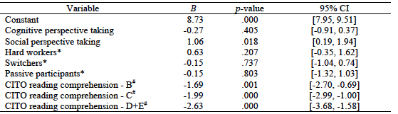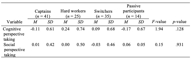Two univariate ANOVAs were used to examine if students’ profiles of cooperative behaviours are related to individual-level perspective-taking ability. Specifically, we evaluated if students in the four cooperative behaviour profiles differed in their cognitive and/or social perspective-taking abilities. Table 5 shows that there was no significant relationship between cognitive perspective-taking ability and cooperative behaviour profiles, F(3, 111) = 1.94, p = .13, nor between social perspective-taking ability and cooperative behaviour profiles, F(3, 111) = 0.15, p = .93. Thus, there is no evidence that students in the four profiles differ in their cognitive and/or social perspective-taking abilities.