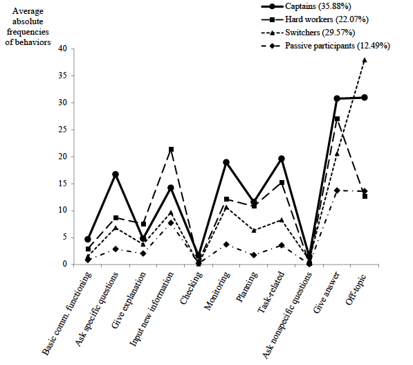 Around 36% of the students displayed a behaviour pattern that we labelled the captains profile. These captains contributed most by asking questions, giving answers, monitoring the process, and engaging in task-related behaviours and, thus, steered the cooperative learning process substantially. However, the captains also frequently engaged in behaviours less beneficial for learning: They were easily distracted, as illustrated by the high occurrence of off-topic behaviours.