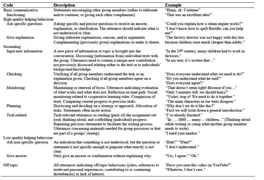 The basic premise of effective cooperative learning is that learning becomes meaningful during promotive interaction between two or more communicative partners who attempt to learn something together (e.g., Johnson & Johnson, 2009). In promotive interaction, group members create the ideal circumstances for themselves and their peers to learn by participating actively, helping others, supporting each other’s thinking processes, sharing information and resources, and negotiating possible solutions. Such a rich learning environment allows for collaborative knowledge construction and can be beneficial for understanding and learning processes (e.g., Johnson & Johnson, 2009; Webb, 2013), provided that students engage in effective cooperative behaviours known to bring about higher individual learning gains (e.g., Erkens, Jaspers, Prangsma, & Kanselaar, 2005; Gillies, 2014; Webb, 2013). Below we will discuss various types of effective cooperative behaviours that can be subsumed under three categories: Basic communicative functioning, helping behaviour, and grounding processes.