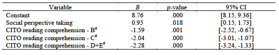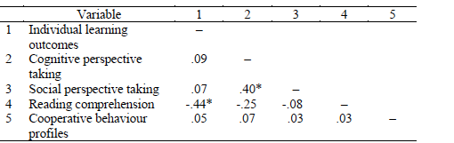 For evaluating the contribution of individual- and group-level perspective-taking ability, cooperative behaviour profiles, and reading comprehension to cooperative learning outcomes, a multilevel analysis was used to take into account the hierarchical data structure (i.e., students working in groups) when predicting students’ individual learning outcomes. The dependent variable was the learning outcome measure (i.e., individual score on the knowledge test), and the independent variables at the individual level were students’ profile membership (dummy-coded), cognitive perspective taking, social perspective taking, and reading comprehension (dummy-coded with the largest class serving as the baseline category as suggested by Field, 2009). The correlations between all individual-level variables can be found in Table 3. Group-level perspective-taking ability (e.g., heterogeneous and homogeneous composition) was added as a group-level predictor.