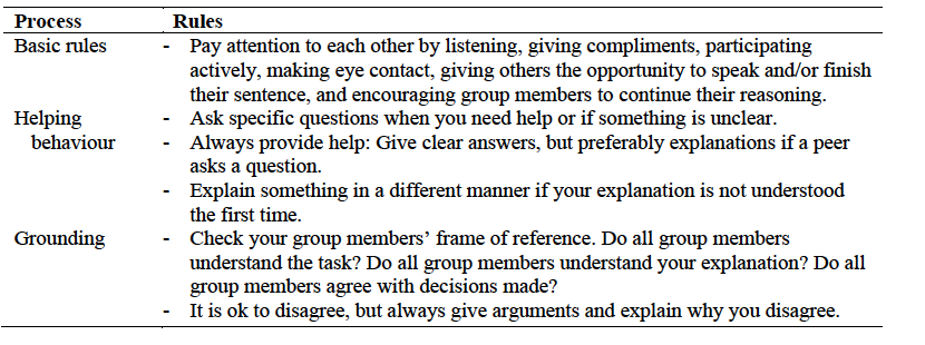 At the start of the second session, an instruction video was shown in which ten-year-old peers modelled both desired and undesired cooperative behaviours. The researchers discussed these fragments with the students and, using a structured questioning technique, six main rules for effective cooperative learning were abstracted. These rules pertained to effective grounding techniques, high-quality helping behaviour, and basic cooperative behaviours such as turn-taking (Janssen et al., 2012; Johnson & Johnson, 2009; Webb et al., 2002). The rules, as outlined in Table A1 (Appendix), were written down on a poster that was displayed in the classroom where students worked on their cooperative assignments.