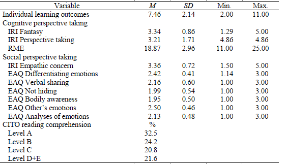 Individual levels of reading comprehension were included in our examination because students worked on a cooperative task highly narrative in nature. The Dutch National Institute for Educational Measurement (CITO) developed a curriculum-independent test that is used nationally to assess primary-school students’ reading comprehension abilities (CITO-Test Reading Comprehension; Egberink, Janssen, & Vermeulen, 2015). Students’ reading comprehension ability ranges from A to E levels (A = 25% best scoring students; B = 25% on or just above average; C = 25% below average; and levels D and E together comprise the 25% lowest-scoring students).