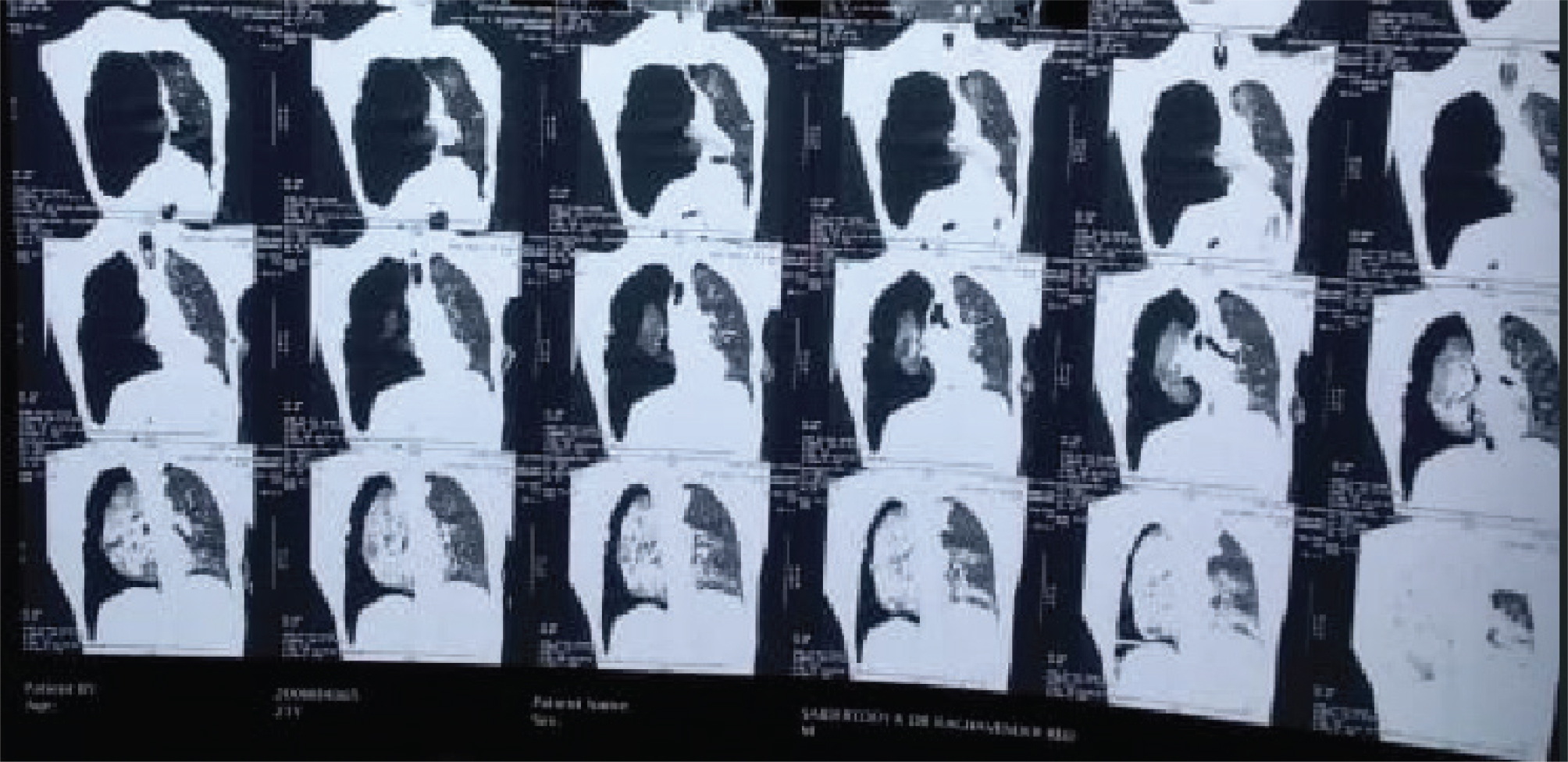 After reviewing the HRCT (Figure 4), the peripheral center team advised the emergency department team to place an intercostal drainage bilaterally immediately.