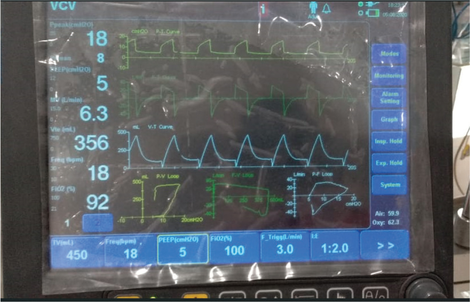 With these advanced bedside data transfer systems and high-definition cameras with PTZ capabilities, we were able to monitor the process of intubation as well as observe the ventilator graphics. The ventilator curve graphs (Figure 5) were monitored to look for any breath stacking occurring in the background of the flail chest. In this way, mechanical ventilation was continued for 4 days with regular support from the tele-ICU team.