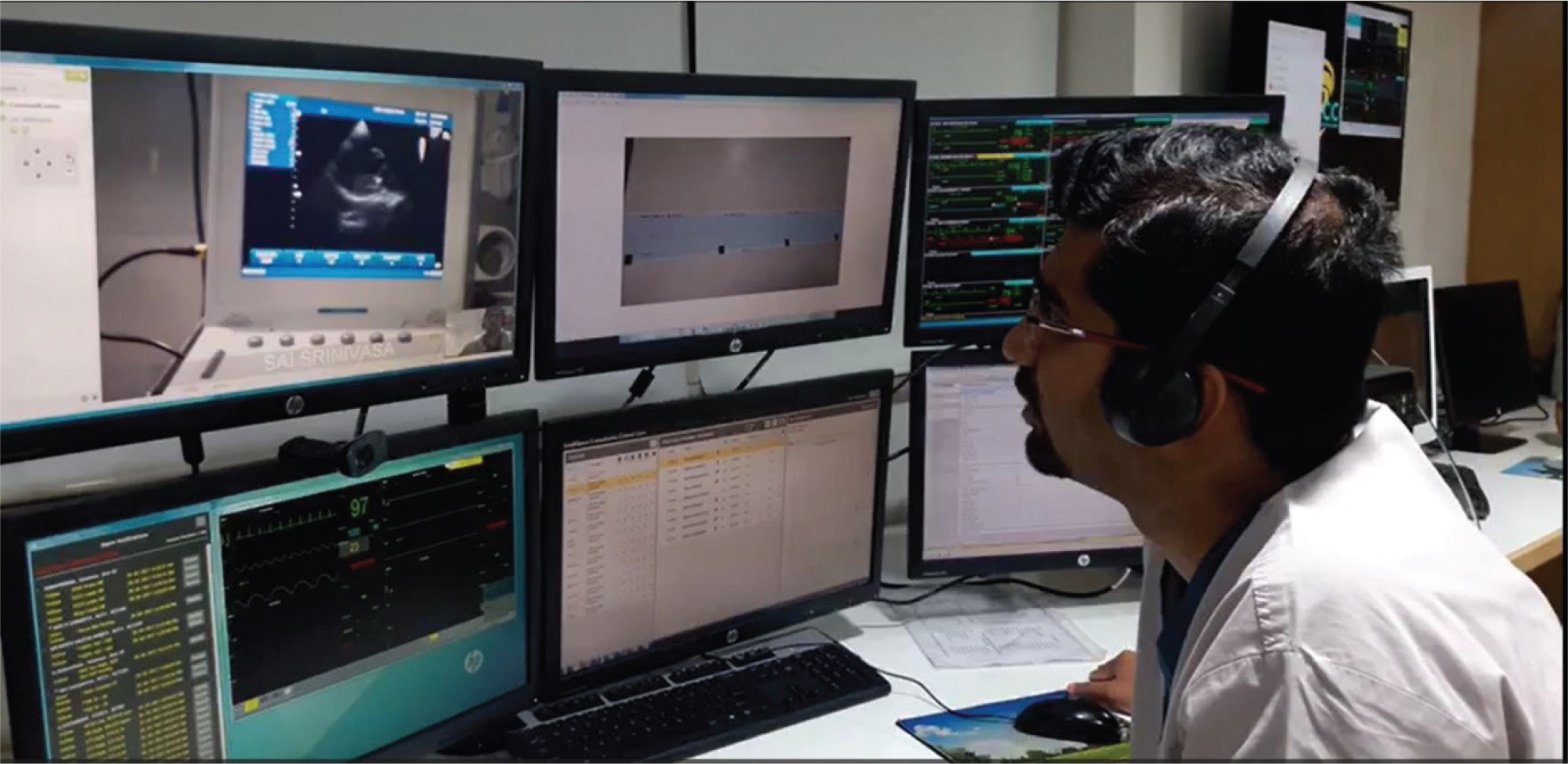 The workflow of tele-ICU setup was discussed in “Telemedicine to Expand Access to Critical Care Around the World” by Ganapathy et al.12 The tele-ICU program in Apollo is well structured and organized. The workflow starts when the tele-ICU staff is promptly informed of a patient’s admission by the peripheral center. Continuous monitoring is immediately initiated, and the patient’s condition is discussed with the doctor and nurse at the spokeswoman’s location. From admission to discharge, the patient is continuously monitored from the Command Center directly using audio-visual aids (Figure 7).