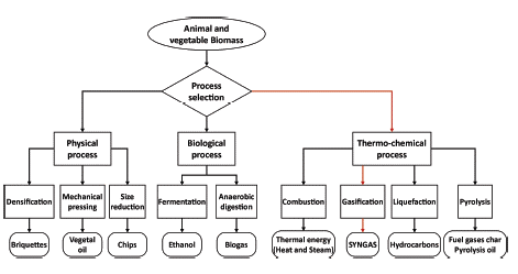 Second-generation or type II biomass is a renewable source of energy and it corresponds to the biodegradable fraction of products, wastes and residues of agriculture, forestry, cattle raising and related industries, as well as the above-mentioned fraction of municipal and industrial wastes (Bentsen et al., 2014; Loffler et al., 2010; Martinez et al., 2018). Additionally, biomass is the only renewable resource that can be transformed into gas, liquid and/or solid fuels by physical, thermal, thermochemical and/or biological processes (see Figure 1) (Balagurumurthy, Singh, Ohri, and Prakash, 2015; Escalante Hernández, Orduz Prada, Zapata Lesmes, Cardona Ruiz, and Duarte Ortega, 2010; ISAGEN, 2005).