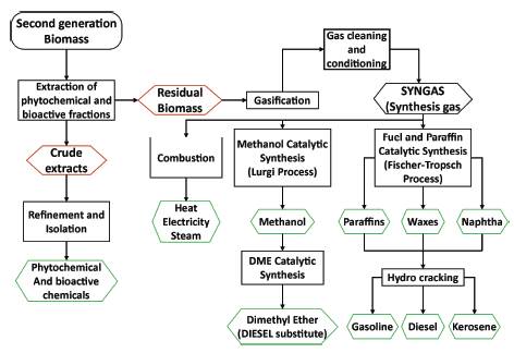 Second-generation biomass is a renewable resource that can address the increasing global energy demand and help to partially substitute the use of and dependence on fossil fuels, since it can be transformed into gas, liquid and/or solid fuels by physical, thermal, thermochemical and/or biological processes. However, its potential is not fully exploited because the process to extract the phytochemicals present in such organic byproducts has been largely omitted. Natural compounds are of interest to high value-added industries such as cosmetics and pharmaceutics. Therefore, this work proposes to thoroughly use such residual biomass in a biorefinery by a simultaneous, efficient and sustainable integration and operation of extraction processes to obtain phytochemicals and functional extracts. A thermochemical process known as gasification is implemented to produce syngas, which can be turned into fuels, chemicals, and energy such as methanol and synthetic gasoline. Furthermore, this review article describes the state of the art of each process and the concept of biorefinery.