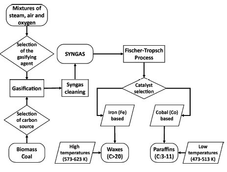 A conventional catalyst based on cobalt (Co) enables the production of paraffinic diesel oils and, despite being expensive, it presents high activity at low temperatures and a ratio of H2/CO or stoichiometric number (SN) value of 2, which extends the useful life of the catalyst and prevents deactivation due to sintering or ageing (Buragohain, Mahanta, and Moholkar, 2010a; Kim, Jun, Joo, Han, and Song, 2009). Additionally, a Fe-based catalyst has also been developed to produce hydrocarbons, namely olefinic gasolines extracted from syngas with a substoichiometric H2/CO ratio, i.e., less than 2 (Buragohain et al., 2010a). Figure 6 presents a diagram of syngas production and exploitation through the Fischer-Tropsch process. Furthermore, it shows some of the conditions and characteristics of this catalytic transformation process of syngas into fuels: