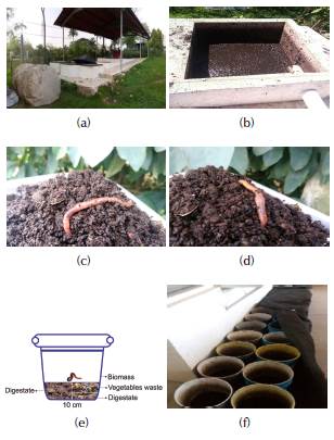 Figure 1: a) Biodigester installation; b) solid fraction ofthe digestates; c) E. andrei and d) E. fetida; e, f) EU assembly.