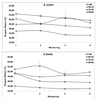 OM values in treatments with both species ranged from 35 to 58%, and a decrease was evident in all of them. E. andrei reached the highest removal rates: 12,75 and 12,50% in extreme treatments 100 and 50:50, respectively. This behavior can be attributed to the voracity of the species and its ease of adaptation to the environment. In treatments with the E. fetida, the decrease was more pronounced in treatments 75:25 and 50:50, with rates of 19,37 and 7,24%, respectively.