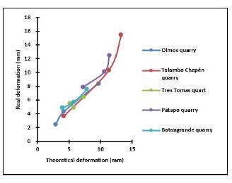 Figure 12 shows the diagram of the theoretical and real deformation of a simple concrete beam per quarry, where non-linear trends are observed between the theoretical and real deformation.