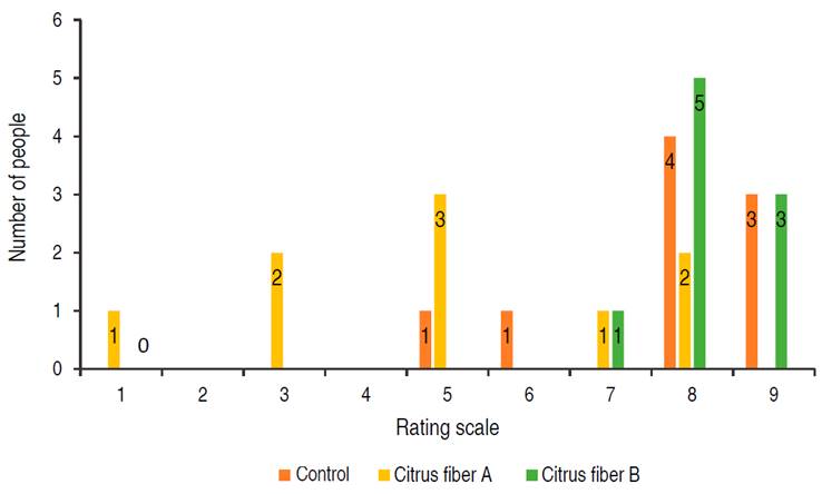 A hedonic test was carried out with a panel of expert technicians composed of 16 people aged between 25 and 35 years, who were given three coded samples (M1 - control, M2 - citrus fiber A and hydrolyzed pork collagen, and M3 - citrus fiber B and hydrolyzed pork collagen) previously. They were asked to rate each of the products on a scale from 1 to 9, where 9 corresponded to "I like it very much," and 1 corresponded to "I dislike it a lot."