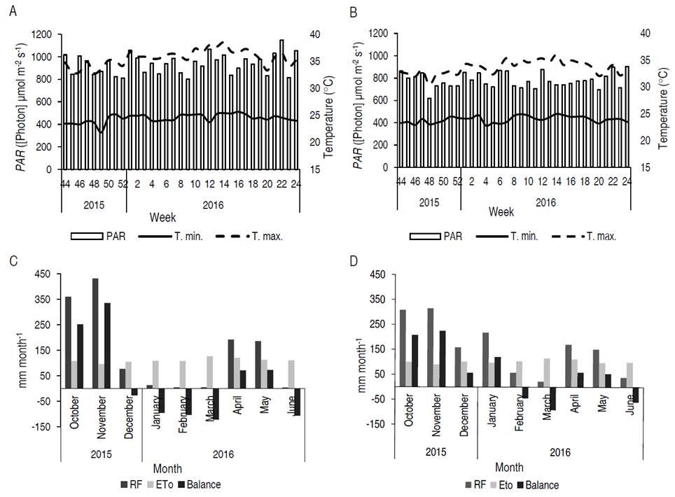 Figure 5: Behavior of photosynthetically active radiation (PAR), minimum and maximum temperatures in A. Nechí and B. Tarazá in weeks 44-52 of 2015 and weeks 1-24 of 2016. Rainfall (RF), evapotraspiration (ETo) and water balance in C. Nechí and D. Tarazá between October 2015 and June 2016.