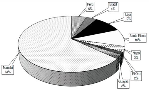 The collection of germplasm consists of 91% of materials from Ecuador (Figure 1), 5% from Brazil and 4% from Peru. After the establishment of the germplasm bank in 2008, the materials brought from abroad were not properly adapted to local conditions.
