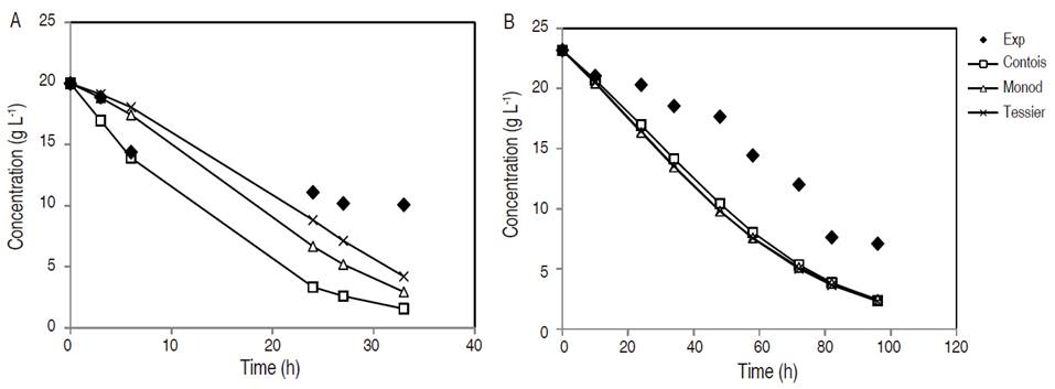 In synthetic media, both Monod and Tessier models adequately predicted experimental values in the first 3 h of fermentation; but after 24 h, the models distanced themselves from the experimental values, being the Tessier model the closest in terms of the reported values. The values estimated by the models behave similarly in non-detoxified OPEFB hydrolysate, where it can be emphasized that the estimated results were similar between the models and completely away from the experimental ones. It is necessary to highlight that the modeling of substrate consumption was based on Equation 5, which is closely related to the growth kinetics variables of each model studied.