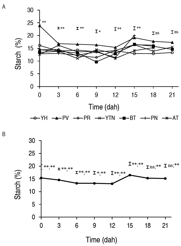 Figure 2: Starch A. in the different arracacha cultivars. B. average. YH: yema de huevo. PR: palirrusia. BT: blanca de tarro. AT: amarilla de tarro. PV: paliverde. YTN: yucatana. Vertical bars indicate the standard error (n=28). * and ** indicates significant effect according to the Tukey test for P≤0.05 and P≤0.01, respectively, between treatments before the semicolon and between times after the semicolon.