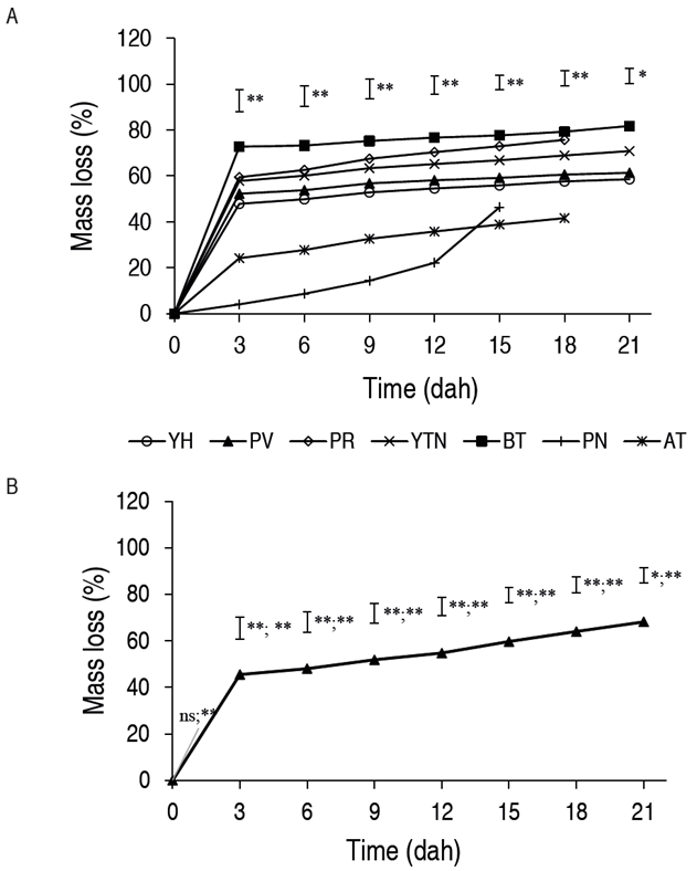 Figure 3: Mass loss A. in the different arracacha cultivars, B. average. YH: yema de huevo. PR: palirrusia. BT: blanca de tarro. AT: amarilla de tarro. PV: paliverde. YTN: yucatana. Vertical bars indicate the standard error (n=28). * and ** indicates significant effect according to the Tukey test for P≤0.05 and P≤0.01, respectively, between treatments before the semicolon and between times after the semicolon.