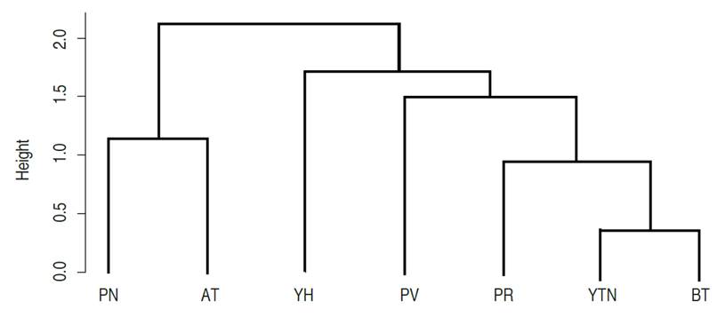Figure 4: Dendrogram of arracacha cultivars. YH: yema de huevo, PV: paliverde, PR: palirrusia, YTN: yucatana, PN: palinegra and AT: amarilla de tarro.