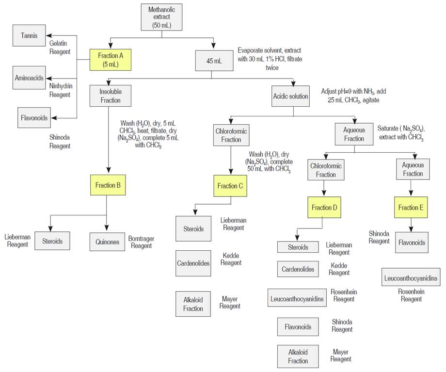 Analytical grade chemicals were used in all the assays and analyses. 2,2-diphenyl-1-picrylhydrazy (DPPH), gallic acid, 6-hydroxy-2,5,7,8- tetramethylchroman-2-carboxylic acid (Trolox), 2,2'-azino-bis(3-ethylbenzothiazoline-6-sulfonic acid (ABTS), Folin-Ciocalteu reagent and methanol reagent and HPLC grade, were obtained from Sigma-Aldrich (St. Louis, MO, USA). Chloroform, potassium persulfate, sodium carbonate, Shinoda, Mayer, Dragendorff,Lieberman Burchard, Borntrager, Gelatine, and FeCl3, Rosenheim, Kedde and Ninhydrin reagents were purchased in Merck (Merck KGaA, 64271 Darmstadt , Germany).
