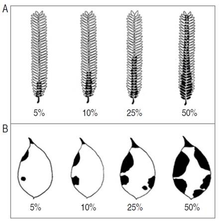 Figure 1: Scale diagrams to measure the severity of foliar Anthracnose (Colletotrichum spp.). A. Leaflets of E. cyclocarpum. B. Leaflets of P. pinnatum.