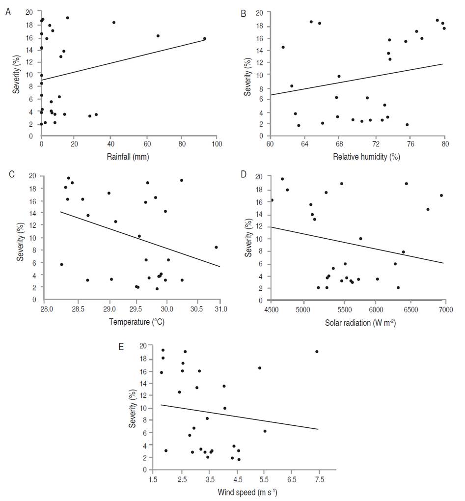 Figure 6: Relationship between the meteorological variables with the severity of foliar Anthracnose in P. pinnatum. The severity with (A) rainfall, (B) relative humidity, (C) mean temperature, (D) solar radiation, and (E) wind speed.