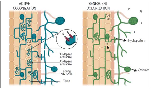 Consequently, the increase of arbuscular structures in the root tissue favors the expression of genes that facilitate the capture of phosphates from the fungal structure to the plant tissue, through proteins located in the periarbuscular membrane (Harrison et al., 2002). However, the dynamics developed for the exchange of elements such as phosphorus between the plant and the fungus are variable. This is because active colonization presents an accelerated movement of phosphorus, mainly when it is scarce. Furthermore, senescent colonization occurs when the hyphal network stops growing and, therefore, it is still unknown whether phosphorus mobility continues between the plant tissue and the arbuscular branch (Kobae et al., 2016) (Figure 2).