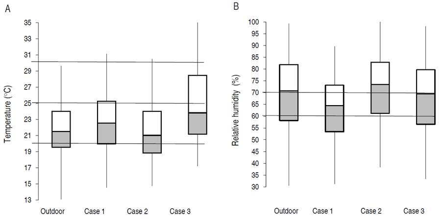 According to the simulations in EnergyPlusTM, Figures 3A and 4A show the thermal behavior of the three cases and the external environment on an average day in November, and the general behavior in a box diagram, respectively. It is observed that the warmest environment occurs in case 3, and the coolest environment in case 2. Concerning workers, the temperature range must be between 14 and 25 °C (MTSS, 1979) and it is observed that the low limit is not exceeded. However, in the warmest hours of the day when there was greater solar radiation, case 3 exceeded the value of 30 °C, thus generating an environment of thermal stress at these hours. This effect can be corrected with passive strategies of natural ventilation.